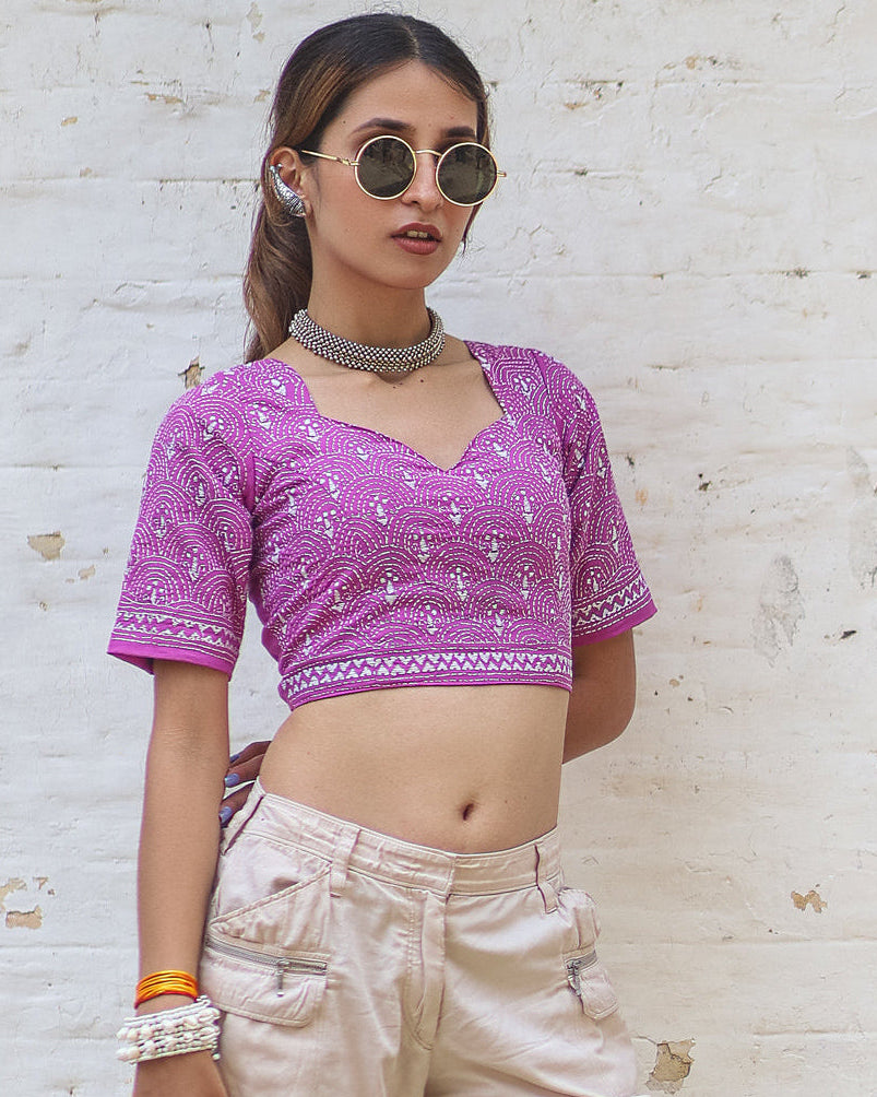 Kantha is a vibrant pink scallop-neck crop top crafted in soft handblock cotton. The delicate motif detailing and flattering silhouette make it your perfect everyday-to-festive piece. Lightweight, breathable and effortlessly stylish for any season.